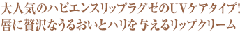 お休み前や唇の乾燥が気になるときにお使いください。メイクアップ前のリップベースとしてもお使いいただけます。 |